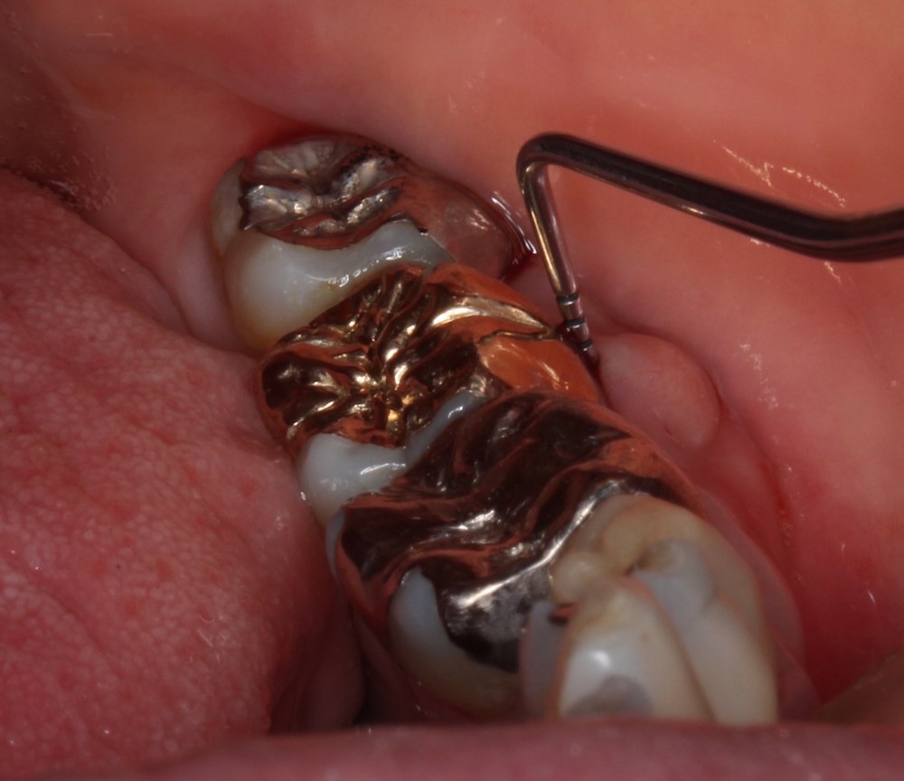 主訴とは、患者さんが一番困っている症状のことです。今回は「左下が痛い」という主訴でした。診査すると、下顎左側第二大臼歯に大きなつめ物が装着されており、歯髄も壊死していて、歯茎も腫れた状態でした。