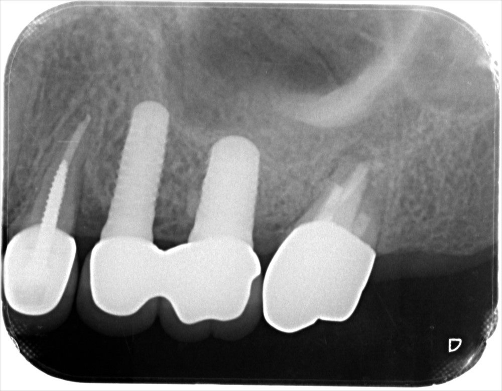 術後1年後のレントゲン写真です。根の先の炎症が小さくなっているのがわかります。歯茎の腫れもなく経過は順調です。