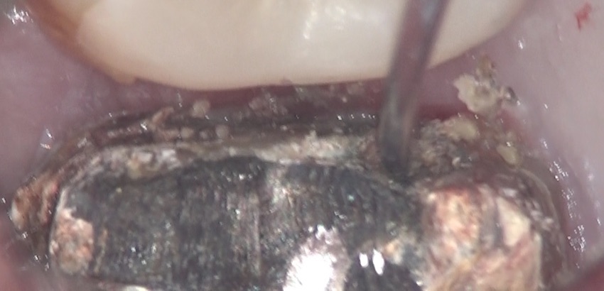 ここで、根尖性歯周炎に罹患している歯に装着されていた適合性の悪いクラウンを外した、その歯の状態を、写真で示します。